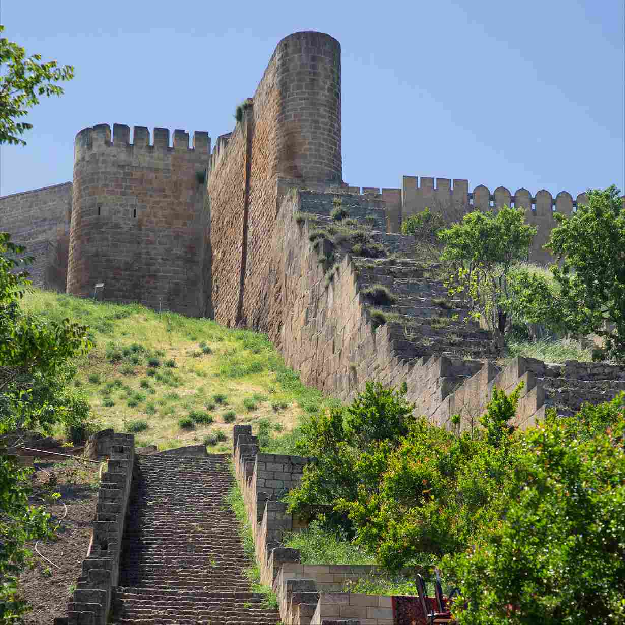 ولعل عينك لن تخطئ قلعتها الشامخة المشرفة على باقي أحيائها من علٍ، والتي تستقبل بحر قزوين وكأنها مارد يحرس زرقة مياهه المتلألئة عبر الزمن، إنها قلعة نارين بحجارتها الصفراء وأسوارها السميكة والممتدة لنحو أربعين كيلو متراً والتي كانت وما تزال شاهدة على قصص ووقائع تاريخية غيرت مسار التاريخ في معظم حواضر شمال القوقاز عبر القرون.