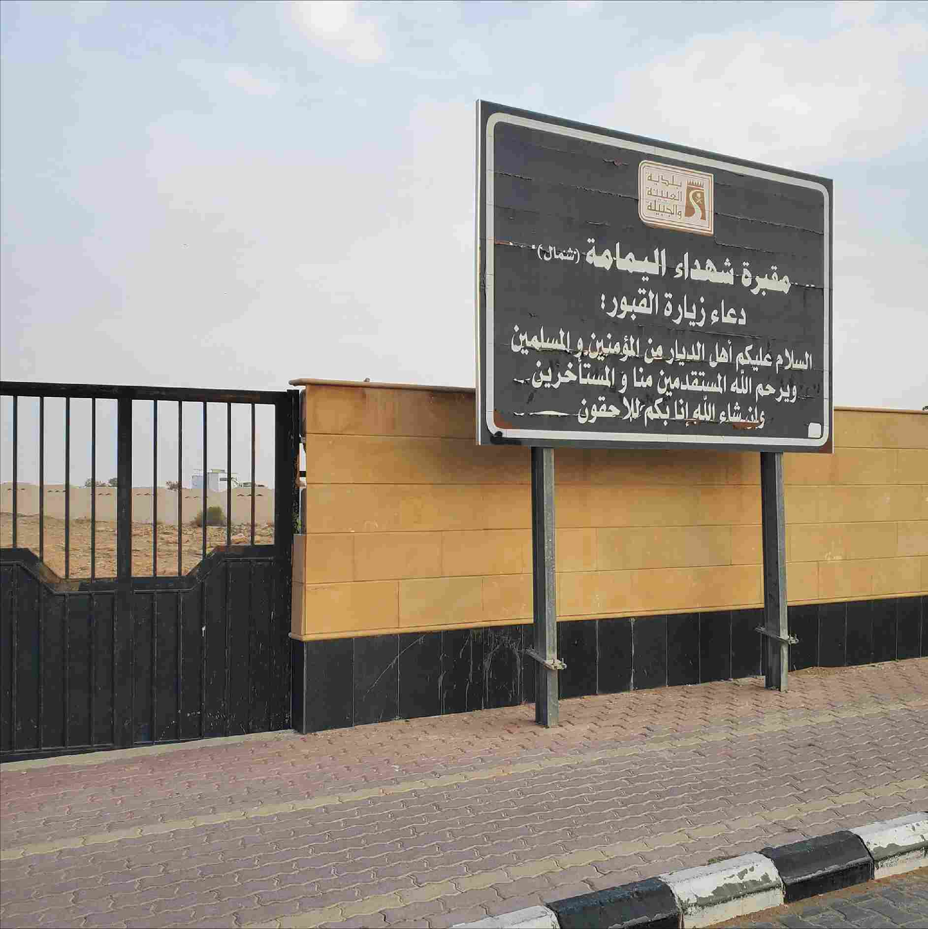 بجانب السور تجد شاهداً كتب عليه "مقبرة شهداء اليمامة" فارفع يديك بالدعاء لهم مستصحباً معك بطولاتهم آنذاك.
